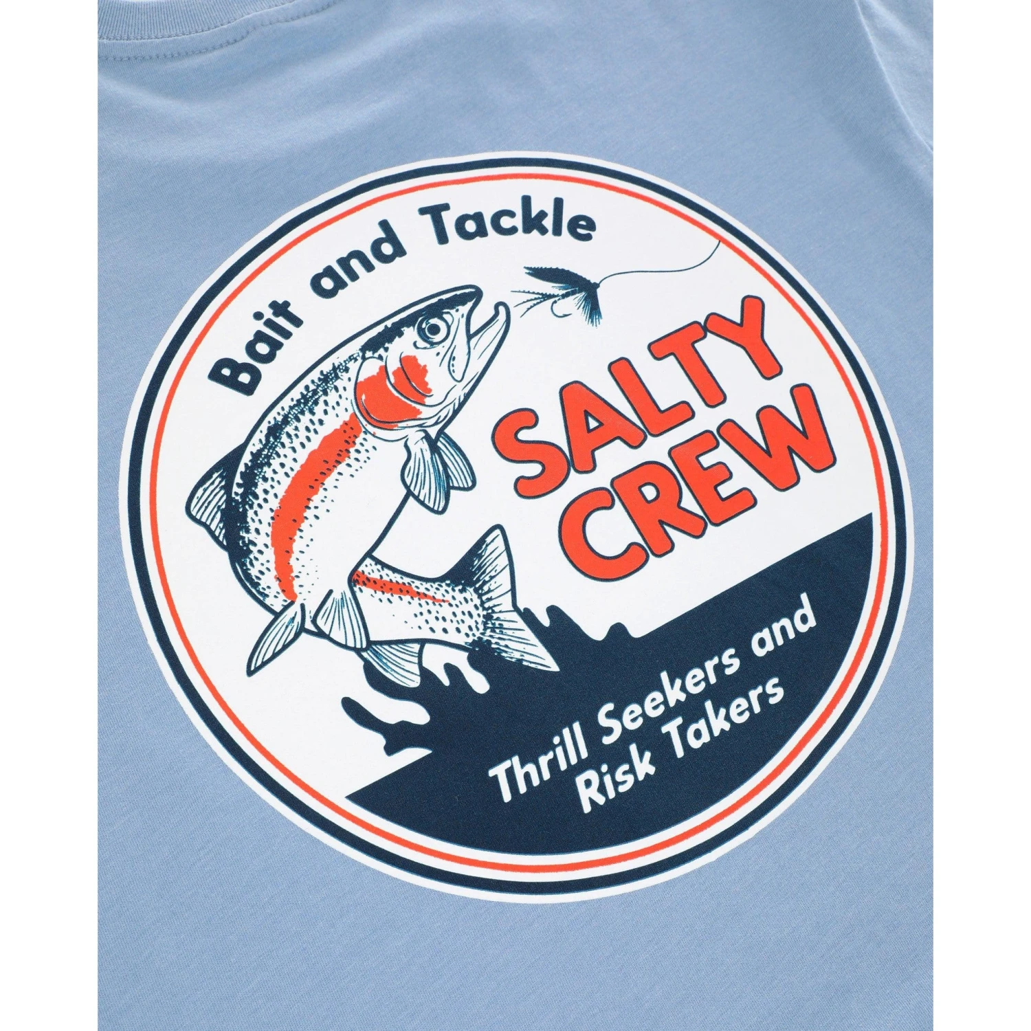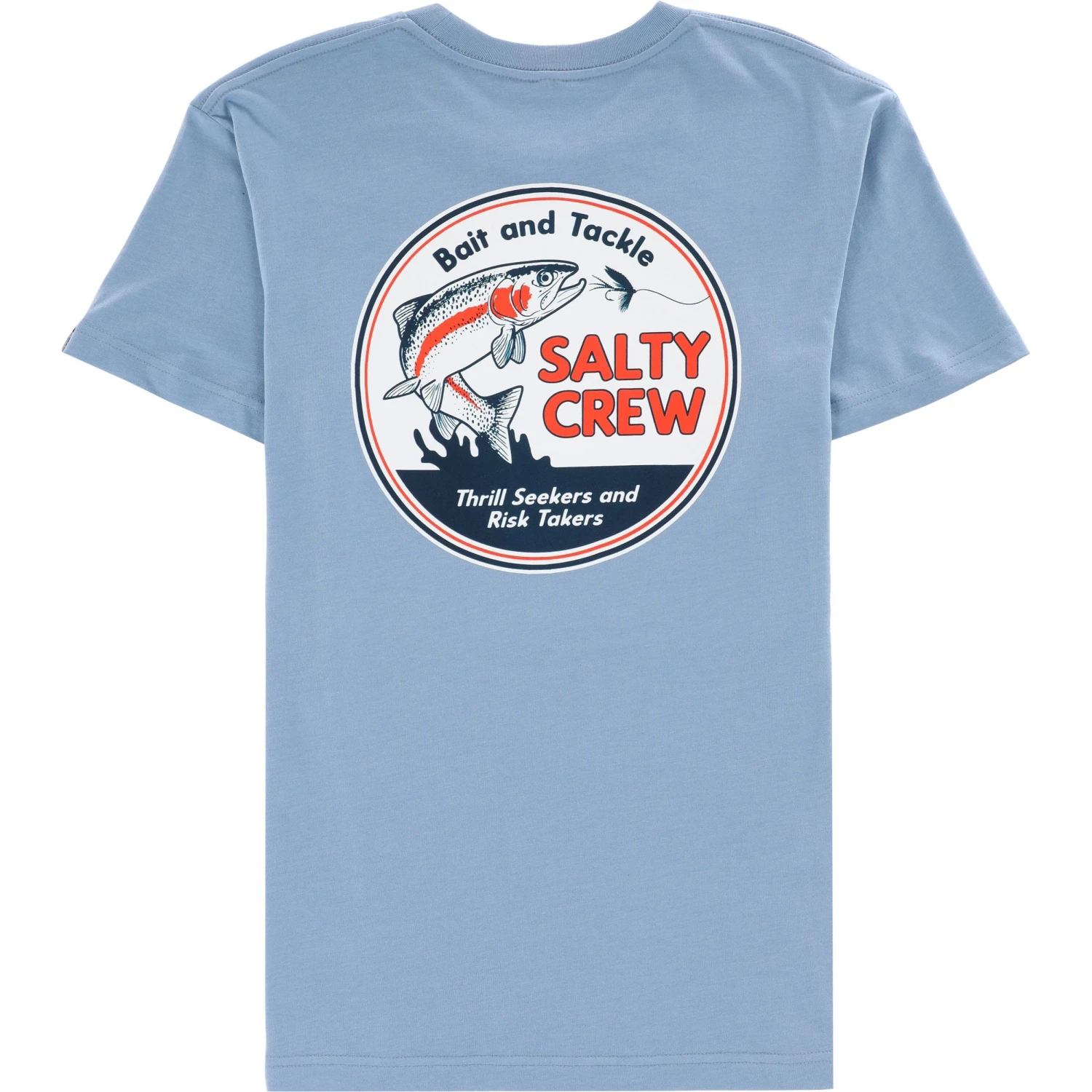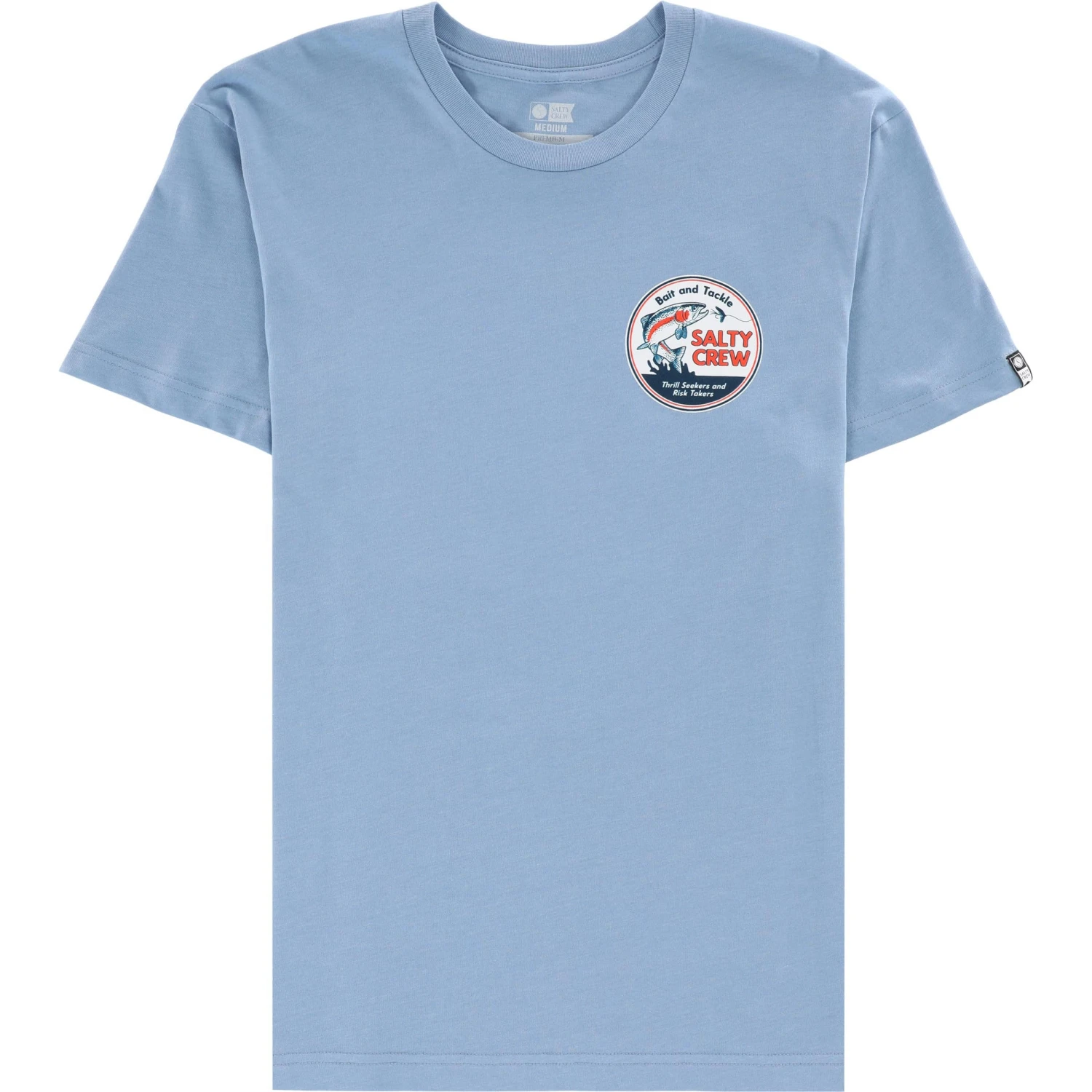 The Salty Crew Fly Guy Premium Tee is a very soft premium slim fit short sleeve tee with an awesome largemouth bass design on the front and back.  The 100% cotton tee is ringspun so it’s comfortable for all day wearing or on the water.  The light blue color of the Salty Crew Bigmouth Premium Tee is very attractive and stands out with the logo colors.