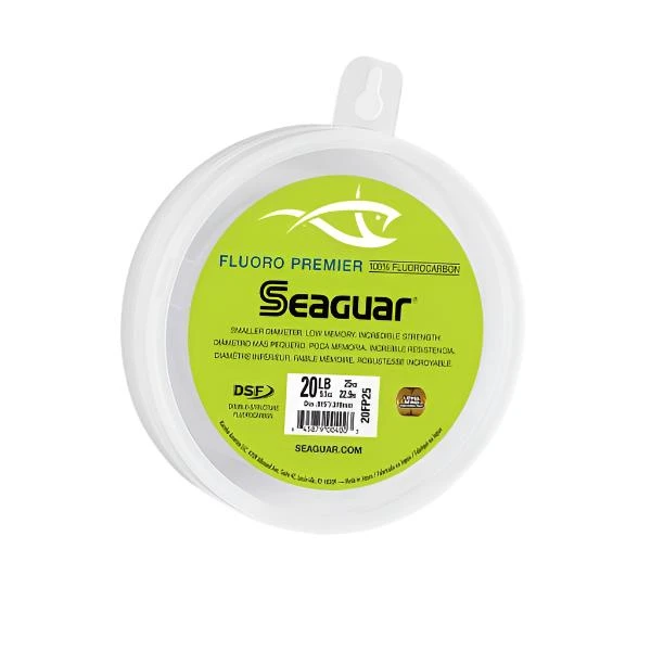 Developed with Seaguar’s exclusive, proprietary Double Structure Technology, Fluoro Premier Leader is leading the market in innovation. Fluoro Premier has smaller diameters and increased strength vs. our FC and Red Label brand leaders. Fluoro Premier offers incredible knot and tensile strength and is an extremely soft line with low memory. Ideal for any leader fishing from 12 to 80 lbs., fresh or salt water. As with all 100% Fluorocarbon products, Fluoro Premier Leader is much less visible underwater than monofilament line and virtually invisible to fish. Fluoro Premier is also UV resistant, chemical resistant, non-absorbant, high-density and impervious to cold conditions.