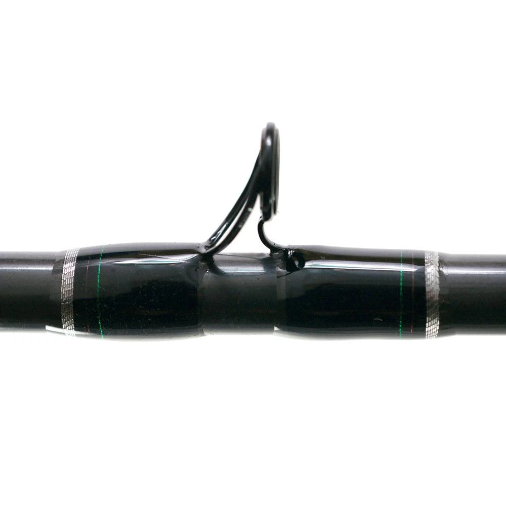 The United Composites Swimbait Finatic Rod lineup is built upon a select number of UC DHX Blanks. The blanks incorporate the Dual Carbon Helix core as well as a layup of multi-modulus layers construction. All Swimbait Finatic rods are equipped with Fuji guides and reel seats along with lightweight EVA grips arranged as a split-grip design. They are attractively single wrapped in black with green and brown metallic detail. Built for the rigors of the ocean but designed for the finesse of the freshwater.
